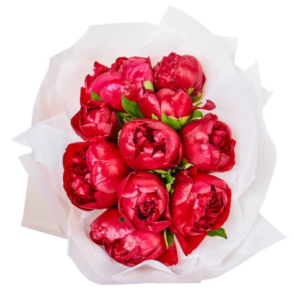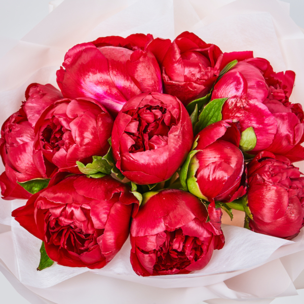 Red peonies are the star of this bouquet, finished off with a soft pink wrapping.