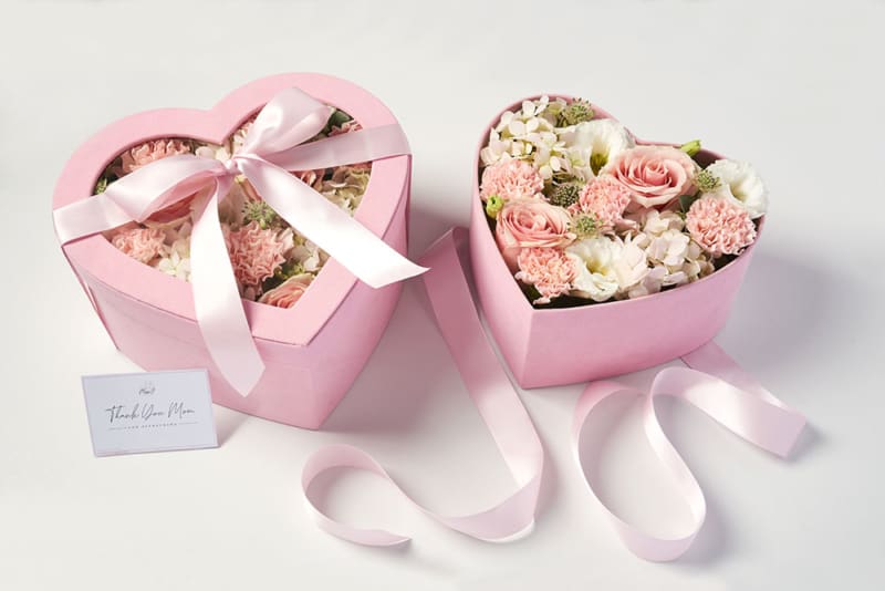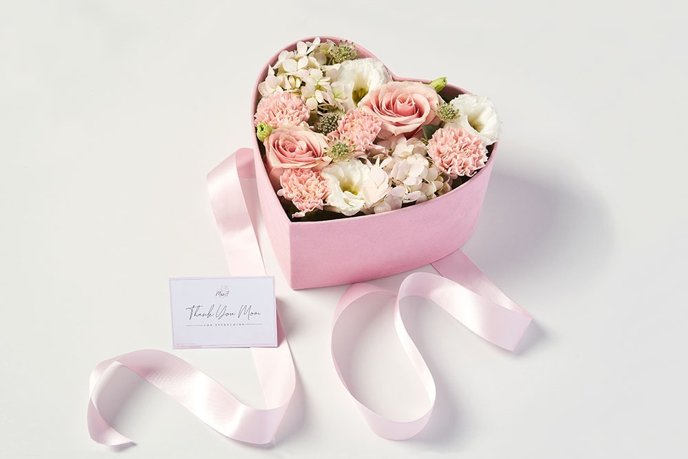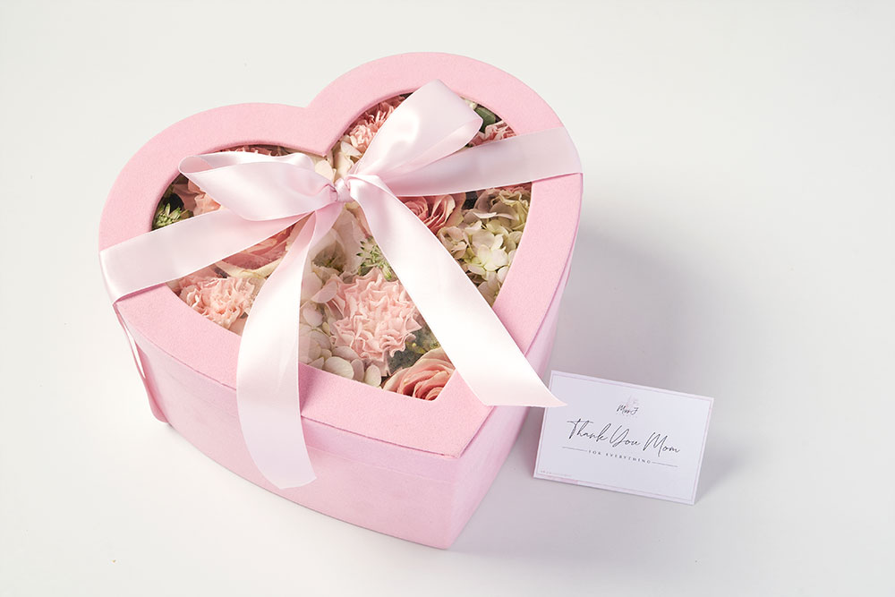 A fresh flower arrangement consists of pink hydrangea, pink roses, pink carnation, white eustoma, and white astrantia in a heart-shaped box.