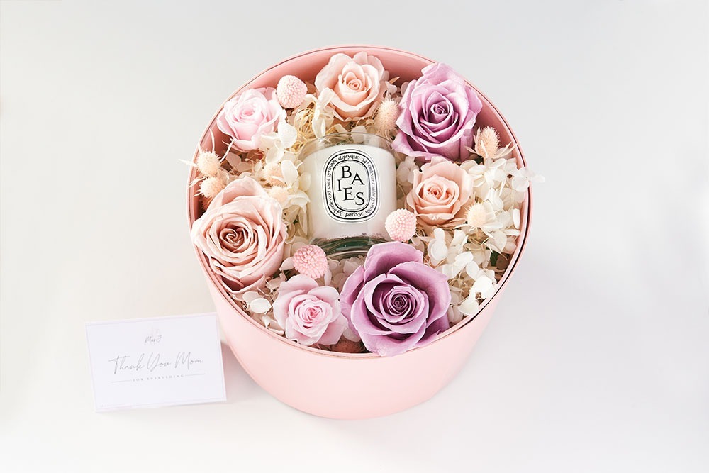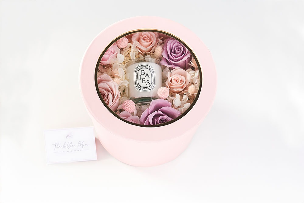 This preserved flower arrangement features purple and pink roses along with hydrangea representing the mother’s love. Finished off with billy button and eryngium, surrounding the fragrant Diptyque candle.