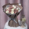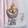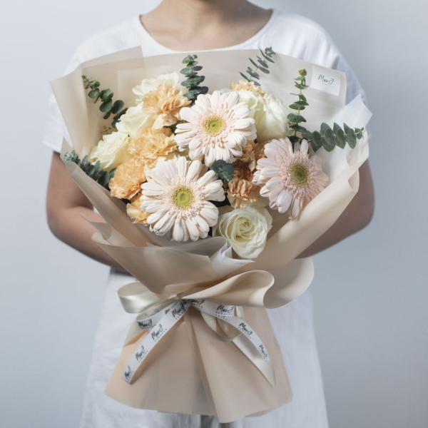 Perfect as gifts and/or showing appreciation for a birthday or special occasion, this bouquet features up to 18 stalks of peach gerbera, white roses and peach carnations. Finished off perfectly with eucalyptus.
