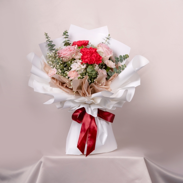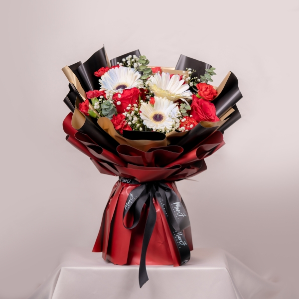 Roses are red, carnations are white, from the day we met, everything seems right. 3 stalks of fresh red roses, 3 stalks of fresh white carnations, and fillers together in a home of love.