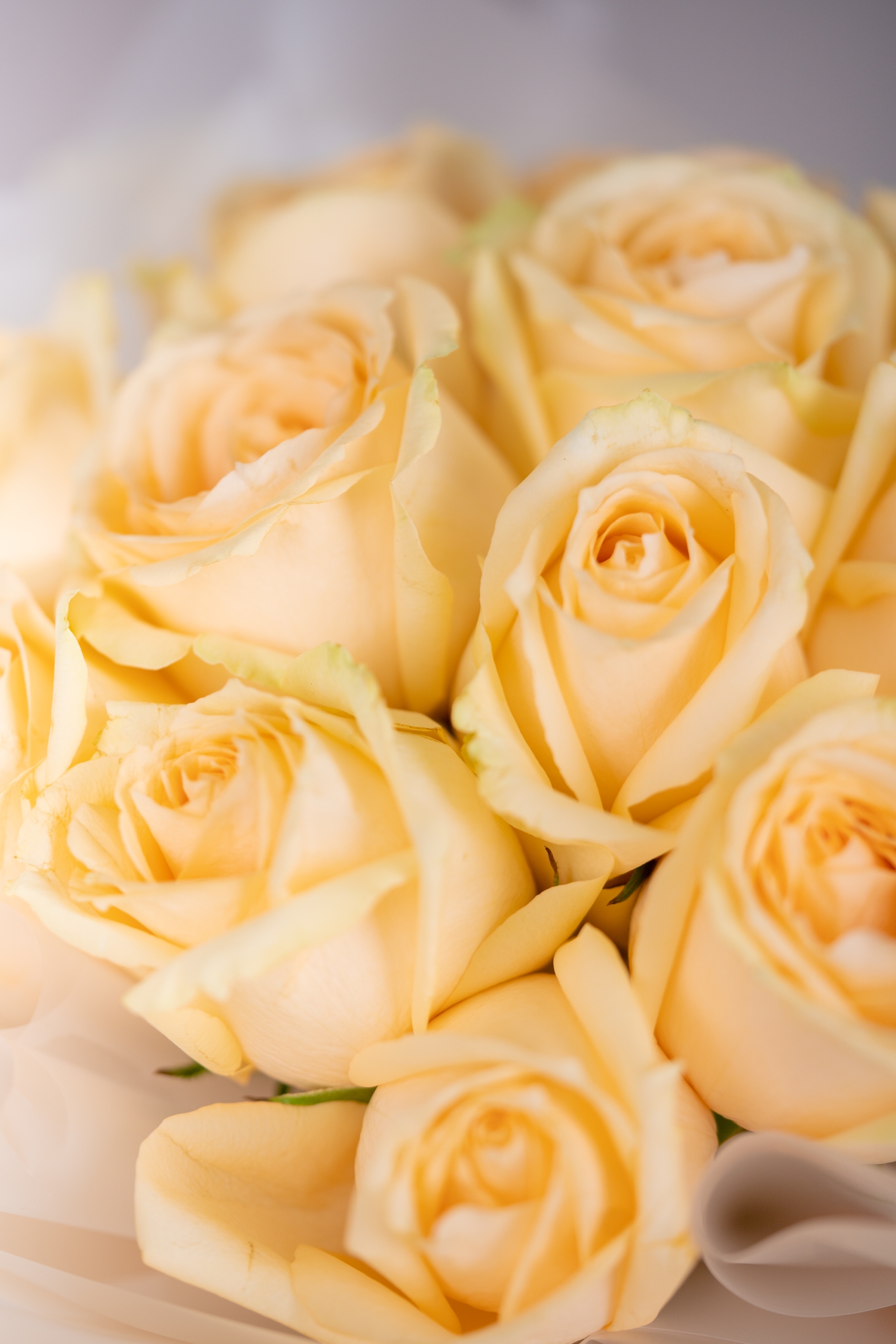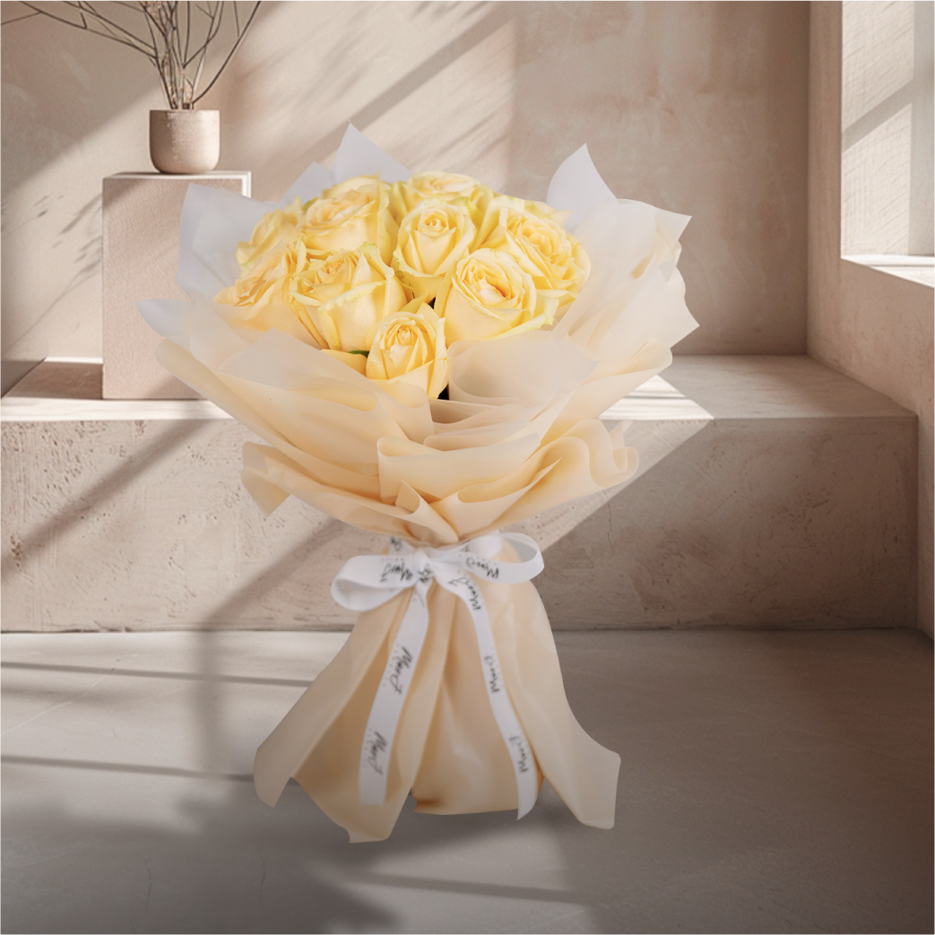 “Champagne Elegance”: Twelve stunning champagne roses, delicately adorned with a white wrapper, offer a sophisticated gesture of love on this Valentine’s Day.