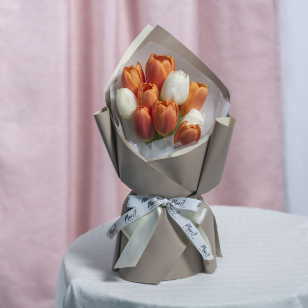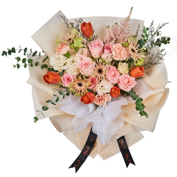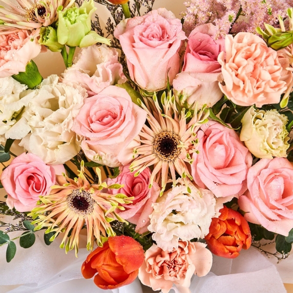 This fabulous mixture of Pink roses, Orange tulips, Pink eustomas, and gerbera daisies signifies loyalty, a sense of understanding and appreciation between two people. Gift this to your other half to tell them that you treasure them a lot!