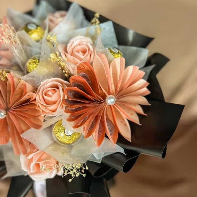 Introducing our exquisite money flower bouquet that is carefully crafted from real currency notes! Honorable is accompanied by delectable chocolates, intricate baby pink soap roses and charming fillers. This money bouquet symbolises abundance and good fortune, making it a meaningful gift for special occasions and celebrations!