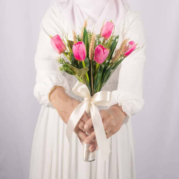 Ivory Oasis is a modern bride’s minimalist dream created to tell the story of the bride’s simplicity and elegance. This bridal bouquet is a simple arrangement of tulips and esutomas with fragrant eucalyptus, wrapped in dreamy organza.