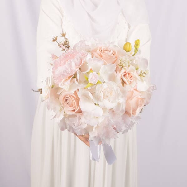 Ivory Oasis is a modern bride’s minimalist dream created to tell the story of the bride’s simplicity and elegance. This bridal bouquet is a simple arrangement of tulips and esutomas with fragrant eucalyptus, wrapped in dreamy organza.