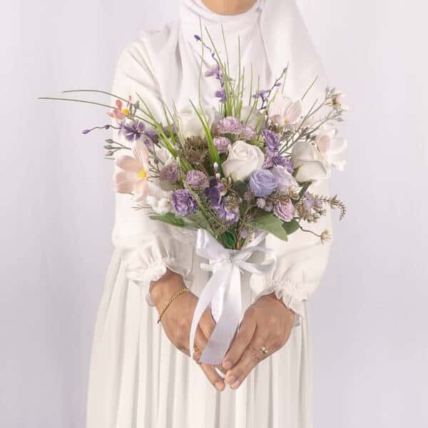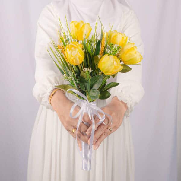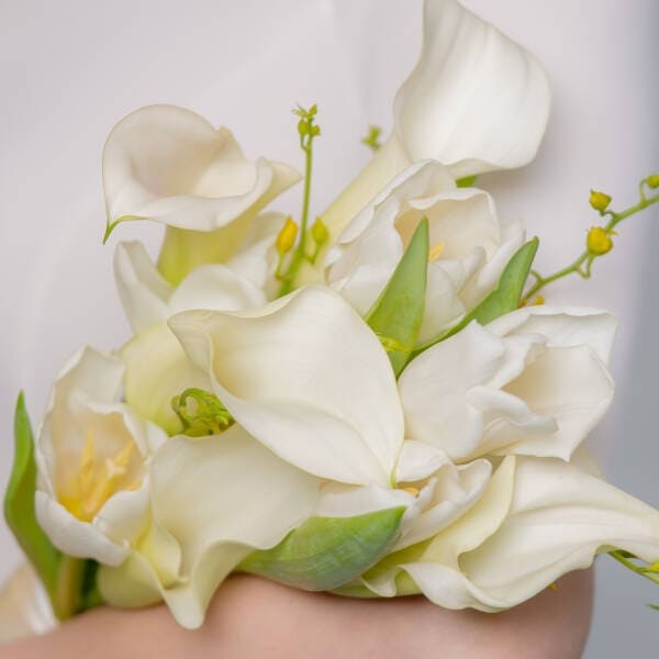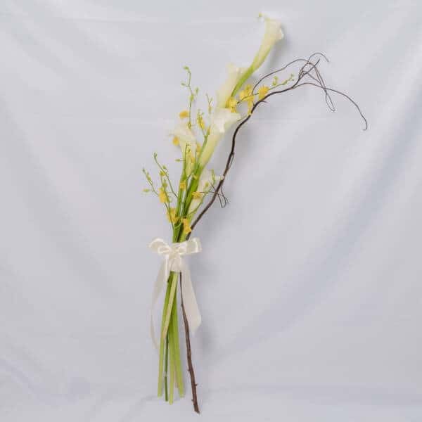 Ivory Oasis is a modern bride’s minimalist dream created to tell the story of the bride’s simplicity and elegance. This bridal bouquet is a simple arrangement of tulips and esutomas with fragrant eucalyptus, wrapped in dreamy organza.
