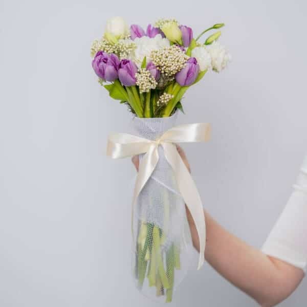 Ivory Oasis is a modern bride’s minimalist dream created to tell the story of the bride’s simplicity and elegance. This bridal bouquet is a simple arrangement of tulips and esutomas with fragrant eucalyptus, wrapped in dreamy organza.