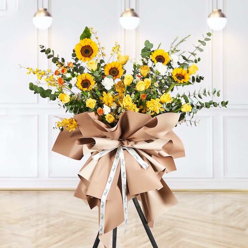 Perfect as a gift to celebrate milestones in life with the bright combinations of sunflower, yellow roses, orange rose spray, Mokara orchid, white rose, white carnation spray, and snow white. Finished with a brown wrapper and white ribbon for a rustic look.