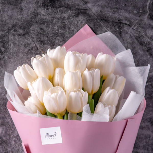 Commonly chosen to convey a deeply passionate and pure love, tulips hold the torch for celebrating a timeless affection shared between two people. This bouquet comes with a pure white tulips, contrasted by duo colour wrappings.