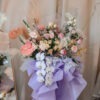 A blend of Light pink, Light yellow, Gradient pink, and Beige roses matched with Pink anthuriums, Pink carnations, and a stream of White phalaenopsis orchid to complete the arrangement. This jazzy and vibrant flower stand will lift the spirits of the receiver!
