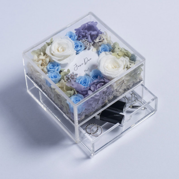 This preserved flowers arrangement can last up to one year. We highly recommend customers to keep Mabel with little humidity. The acrylic drawer box can be used for storage or decoration purpose.
