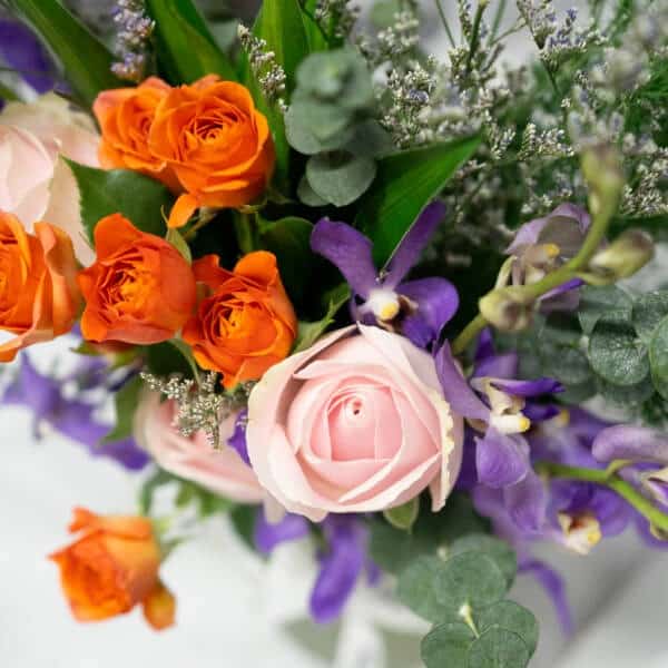 A tapestry of colours and texture, Magnificent is a bona fide of its name that will brighten up any room you place it in. Soft pink roses, purple orchids, and dainty casphias blend seamlessly in this captivating fresh flower vase arrangement.