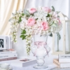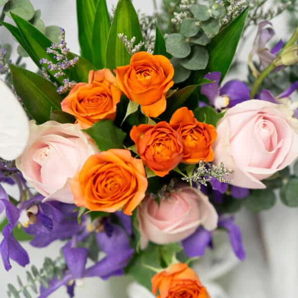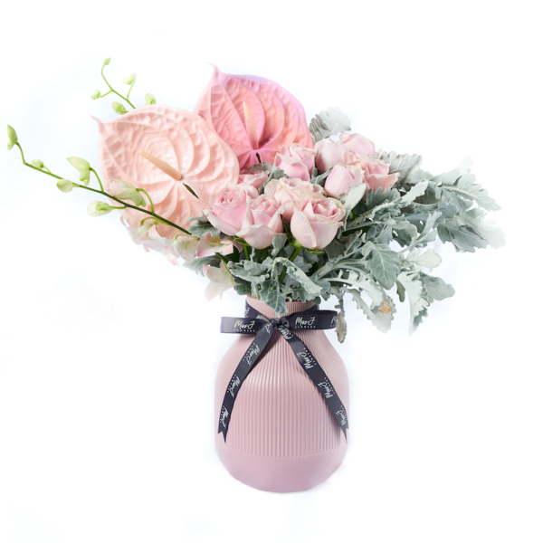 An elegant pink creation that will melt any ladies heart once they set eyes on this special creation. The silver leaves bring out the dreamy characteristics of pink roses, making it difficult for anyone to not admire it’s beauty.