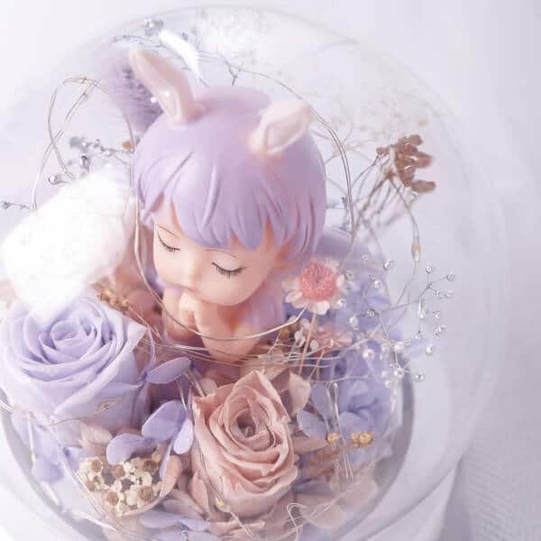 Immerse yourself in Raina where a pretty baby fairy is nestled amidst dusty pink and purple roses, elegantly encased in an acrylic ball adorned with twinkling fairy lights. Experience the magic and beauty of this whimsical creation, a true delight for the senses.