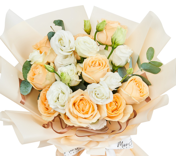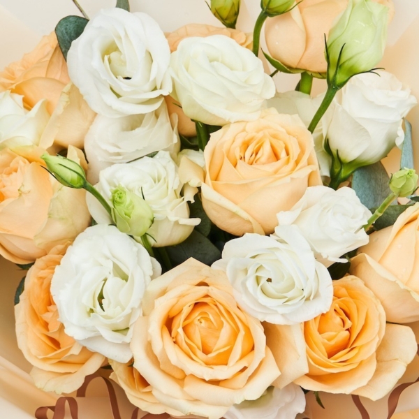 A mixture of Champagne roses, White eustomas, and Orange rose spray symbolizes your passion towards the other person while you compliment his/her charms.